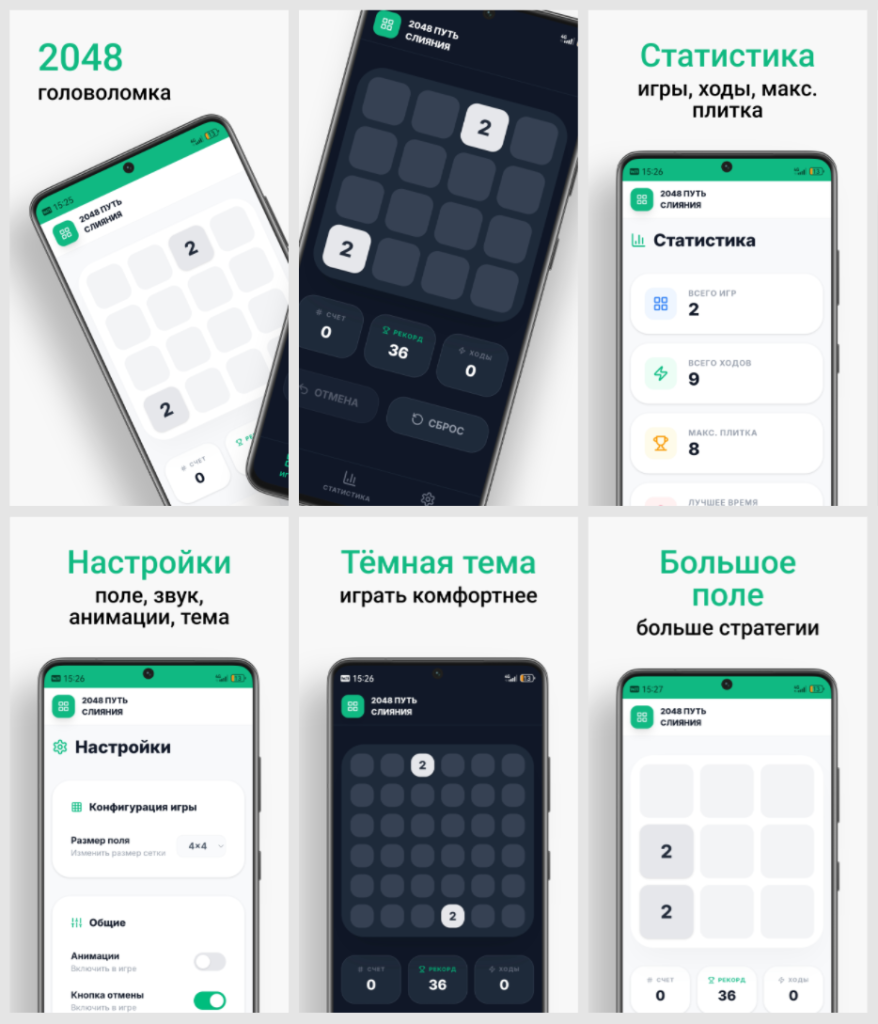 Игра сделана в классическом духе 2048, но с аккуратным современным интерфейсом, поддержкой светлой и тёмной темы и настраиваемым размером поля. Можно выбрать привычный формат 4×4 или расширенное поле, если хочется больше пространства для стратегии.
